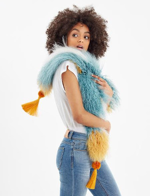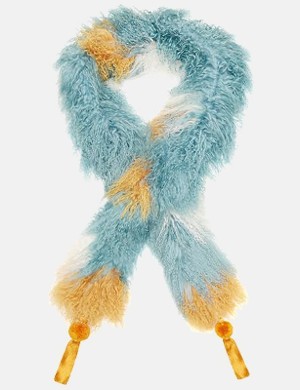 Introduce a flurry of colour to your wardrobe this season with a Hayley Menzies tricolour Foxy Boa, made from soft Mongolian fur. With shades of ochre, bright white and duck egg blue, this is the ultimate lamb shearling scarf for trans-seasonal styling.