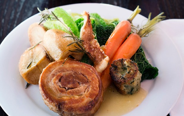 We were here specifically to review the Sunday lunch (late—it’s on the menu all day), but as we are exceptionally greedy we went for starters too. My mussels in a white wine reduction—a generous portion for £8—were spot on, the shellfish plump and spankingly fresh, the delicately savoury vinous emulsion lip-smackingly good. The warm ciabatta served alongside to mop up the juices tasted fresh from the oven. Andy’s crab and avocado boat with chilli, coriander and lime (£7.50) was equally successful, the zingy Mexican-inspired flavours working perfectly with the sweet crab meat and creamy avocado.