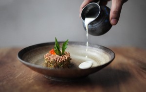 ...house kimchi, sesame & ssam, and small plates (<£8) such as Miso & mango glazed aubergine with peanut crumble, Clouds of curds with gram confetti, mint relish & guindilla chilli,...